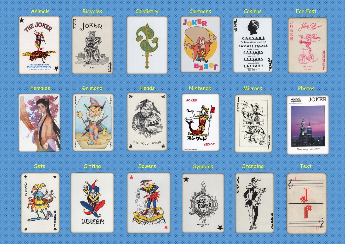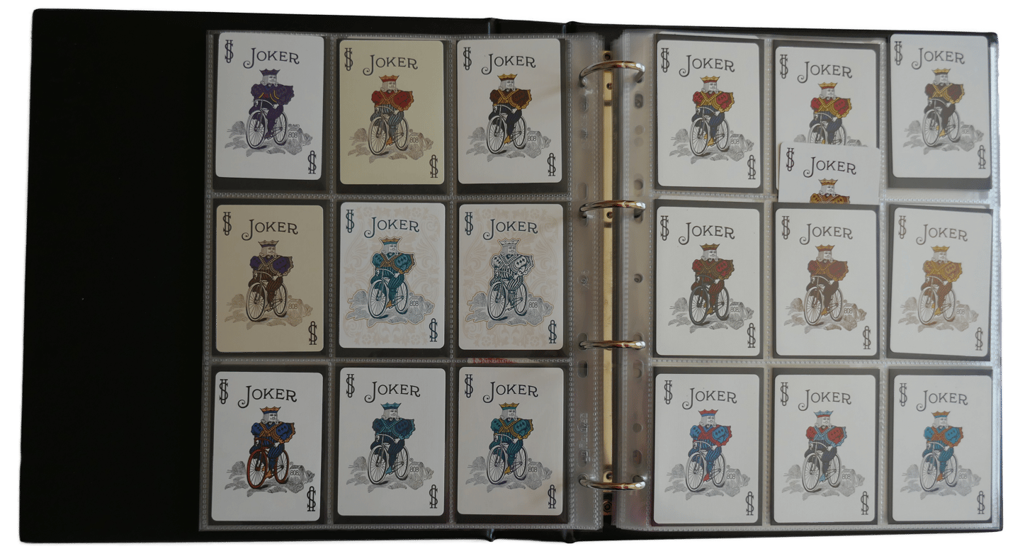 Playing cards are an ephemera item and therefor need careful handling. Repeated handling increases the risk of damage and further deterioration. An organised collection will go some way to keep order and preserve your cards. Digitalising a collection by scanning the images can reduce handling and could be useful when there's a need to search for a particular item. Purpose made albums can store around 500 jokers (back to back) and they look awesome when they are grouped together. Clear see through (acid free) plastic pocket pages enable you to display your jokers in their full glory.