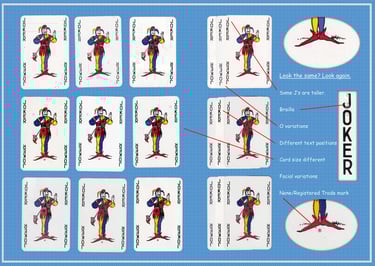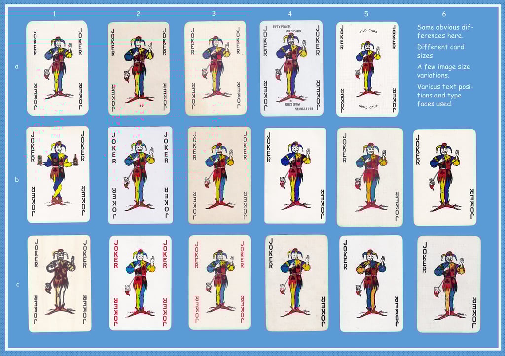 Look the same? Look again. Whilst some variations are obvious others may go undetected. Using the standard Waddington’s joker this series examines the variety of differences available.