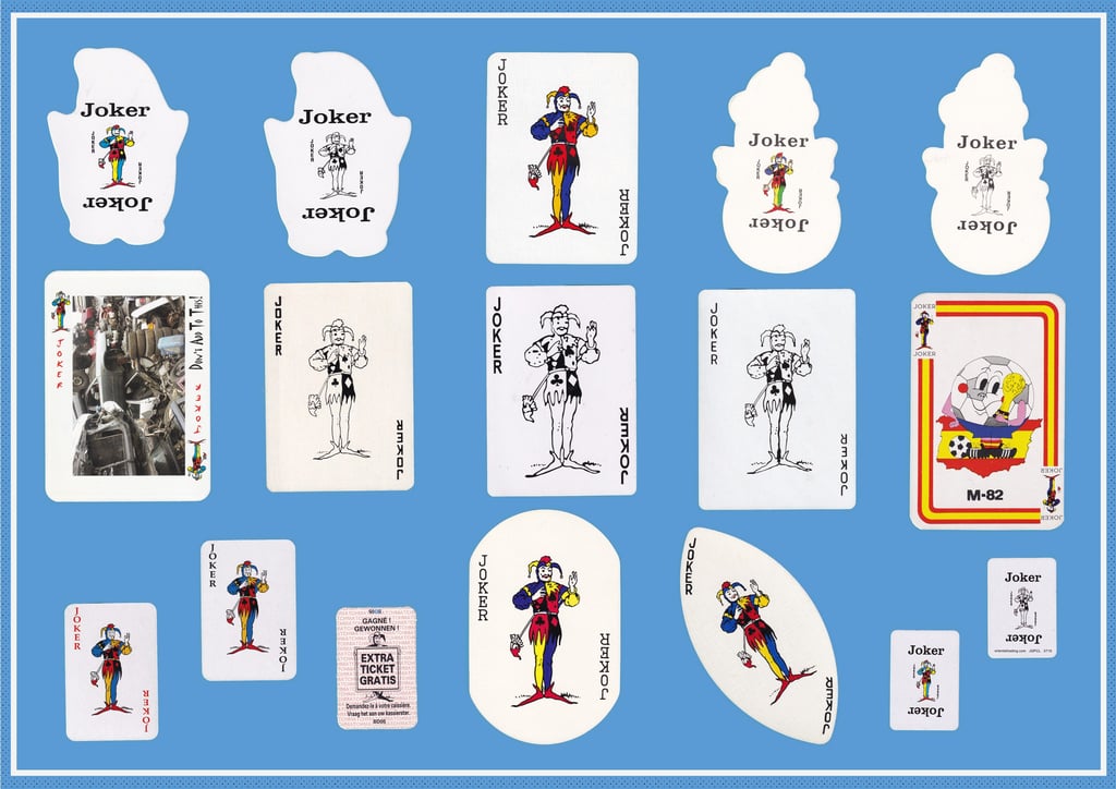 Using the standard Waddington’s joker, this series examines the variety of differences available. Here we have a wide range of shapes and sizes, illustrating both the diversity and intended use. Playing cards in general have adapted and evolved over the years into a multi-purpose and popular item.